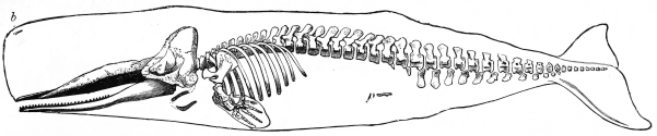 6. A Porpoise, adapted solely for swimming in the water. The fore-limbs are converted into flattened paddles, and the hind-limbs are entirely absent, their function being performed by the tail. The rudimentary pelvic bones are preserved.