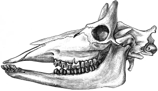 The greater part of the north side of the gallery is devoted to the exhibition of the remains of Proboscidea (Dinotheres, Mastodons, and Elephants), as well as teeth and skulls of the two existing species of Elephants. The forerunners of the Proboscidea from the Eocene strata of Egypt, as represented by Palæomastodon and Mœritherium, are of special interest. Attention may likewise be directed to the skull of the gigantic Ruminant Sivatherium (fig. 46), from the Siwalik deposits of Northern80 India, an ally of the living African Okapi (p. 41), with which it is connected by Helladotherium of the Grecian Tertiary deposits; another still more nearly allied type being Samotherium, from the Isle of Samos, of which a skull (fig. 47) is exhibited.