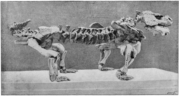 The long corridor north of the fossil Mammal-gallery contains a fine assemblage of Reptilian remains. The south side is devoted to the Great Sea-Lizards (Sauropterygia and Ichthyopterygia), mostly from the Lias formation. The skeleton of an Ichthyosaur from the Lias is shown in fig. 50. Skeletons of Plesiosaurians and Pliosaurians from the Oxford Clay are mounted in central cases. Ranged in the cases on the north side are remains of the gigantic Dinosaurs, which vastly exceeded in size any other land-animals. A mounted plaster cast of a complete skeleton of the Iguanodon (fig. 49), found (with many others) in the Wealden strata at Bernissart in Belgium, is exhibited in the gallery of recent Reptiles; but a large series of bones of the same reptile is shown here.