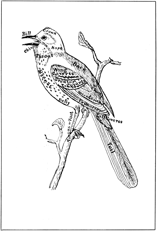 Markings and Color: See just where the markings are. Remember that if a bird were seen without feathers, it would look quite a bit like any other animal. The next time you have a chicken after the feathers have been removed, look at it closely. The wings look like arms, and as a matter of fact, they have three “fingers,” which may be easily seen. The bird has a crown on its head; he has “cheeks,” a breast, a throat, a belly, and a rump as well as other external or outside parts. Do not say that you saw a bird that was “black and white and brown all over.” No one could tell you what sort of a bird that was. See—just what you are looking at. As with the Markings, you should know something of the parts of a bird before you are able to tell just where the colors occur. How many colors are there on the under side of the Robin?