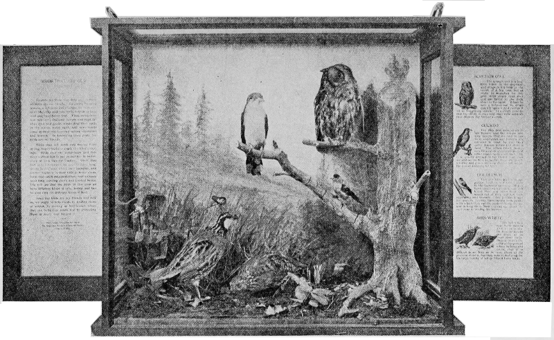 One of the new “Habitat Group” circulating nature-study collections. The label-holders are hinged to the back of the case and close over the ends, protecting the glass during transportation. The label at the left is general and gives reasons why birds are our friends. That on the right deals with the habits and use of the specific birds in the case, each being identified by a simple drawing instead of by title or number.