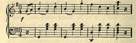 —Perhaps the most inveterate of these modern habits of musical thought is the harmonic habit. It is second nature for us to conduct all our musical thinking in terms of harmonic relations. We think of chords as related to one another in certain fixed ways, as forming groups or clusters just as definite as the groups of atoms in a chemical molecule. It is not more sure, for example, that in a molecule of water two atoms of hydrogen are engaged or held in combination by one atom of oxygen, than it is that in any key the dominant and sub-dominant chords are held in the position of subordinate companions by the tonic chord, and that the other chords of the key are held in more remote but still perfectly fixed relations with this Paterfamilias of the harmonic family. We think of the chords in a phrase, of whatever length and complexity, as progressing in a coherent series, as intertwined one with another by manifold relationships, and as embodying, all together, some one key. For us, every composition is in some particular key as inevitably [55] as every poem or essay is in some particular language. We modulate freely, to be sure, from key to key; but this rather intensifies than obliterates our sense of key, just as the process of translating from one language to another intensifies our sense of the peculiar idioms of each. Our whole manner of thought would be as indescribably shocked by a passage which placed together, cheek by jowl, chords belonging to different keys, as by a sentence every word of which was drawn from a different tongue.