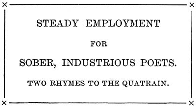 A quarter of a century hence, perhaps, one of those arbiters of taste to whom poetastry owes its very existence will lecture before the intellectual and artistic circles of that period on “The Literary Remains of the Bonnerian Period”; and the Ledger school of poetry, long neglected by our critics, will become a fashionable cult. I hope, too, that the names of those writers who, as disciples of that school, gave an impetus to those great principles which live to-day in the beautifully printed pages of our leading periodicals will be rescued from the[Pg 12] shades of obscurity and accorded the tardy credit that they have fairly won.