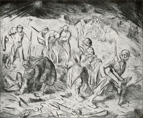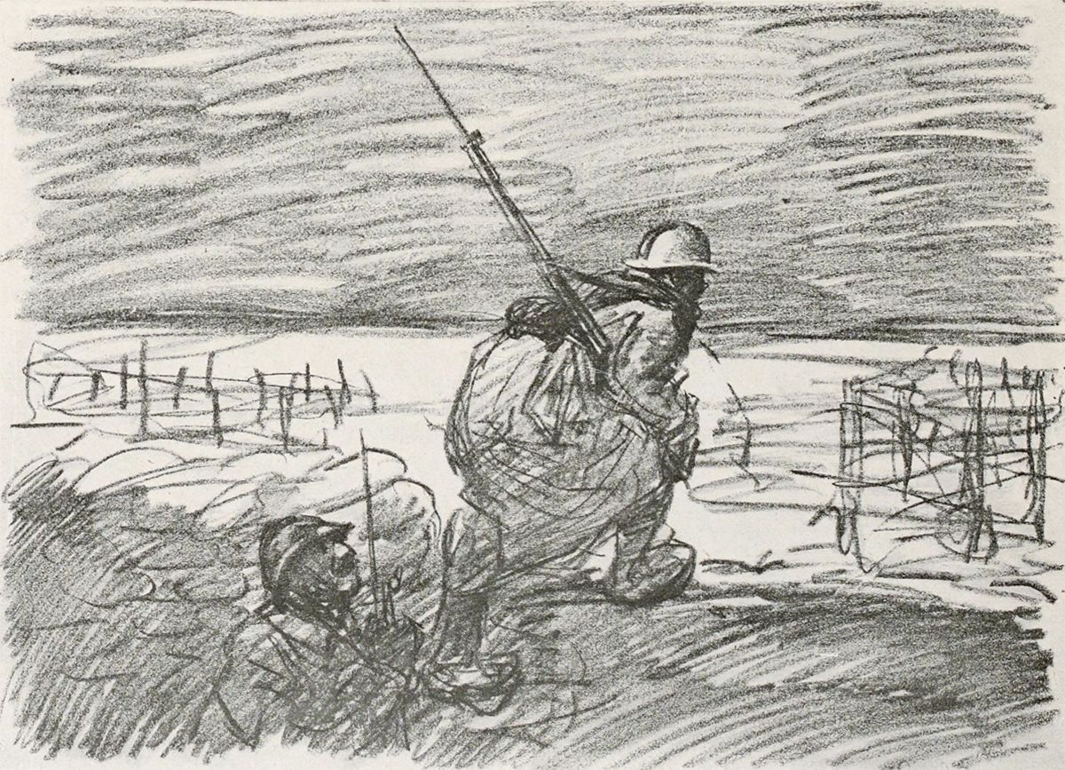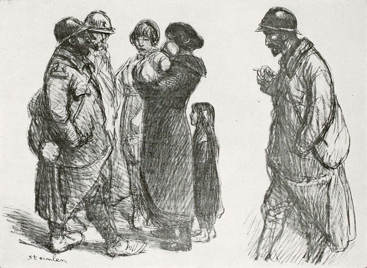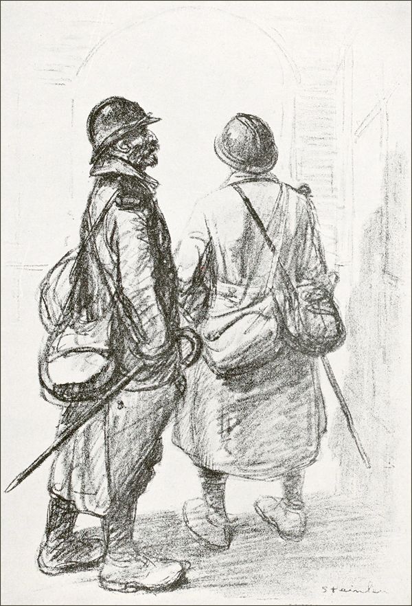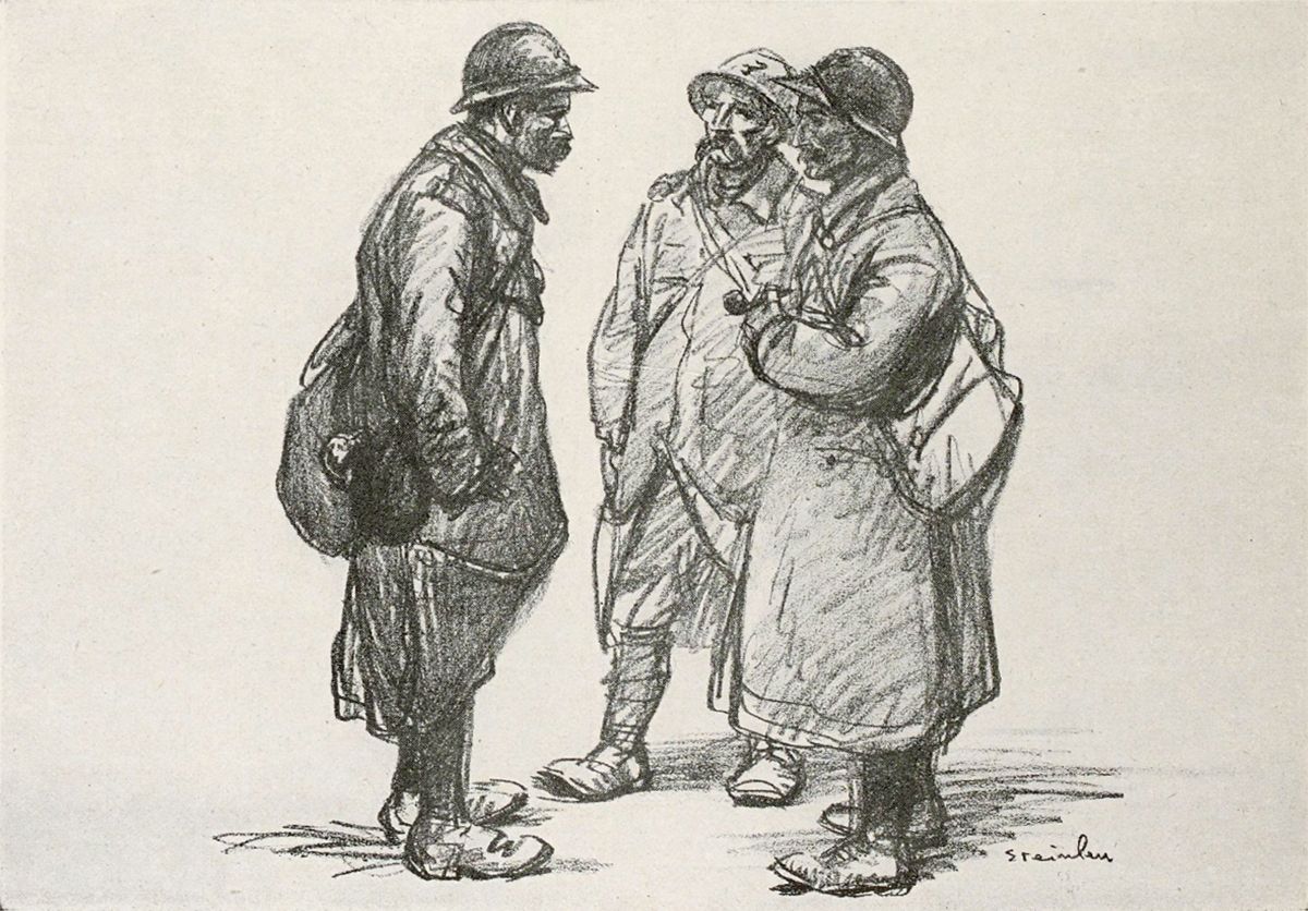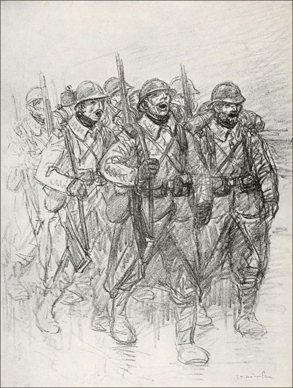 Steinlen a intitulé une de ses séries de dessins: Les Ouvriers de la Guerre. Cela est typique. Cela définit bien ce qu’est pour nous tous cette lutte: un travail, plus important que tous les autres travaux qu’il nous a fait délaisser, une entreprise collective de démolition d’un système d’idées monstrueuses, coûte que coûte, avant la reconstruction possible—l’immense déblai de l’avalanche barbare écroulée au milieu de la civilisation.