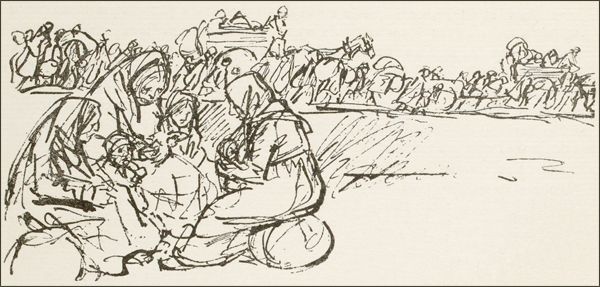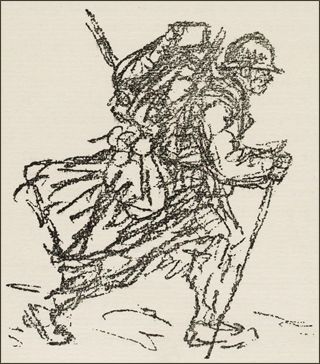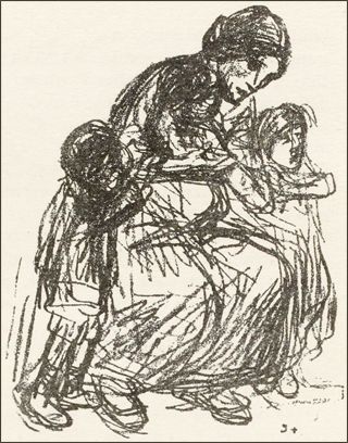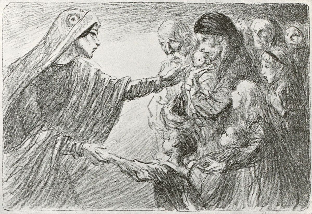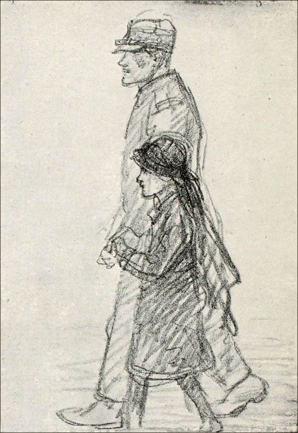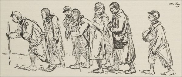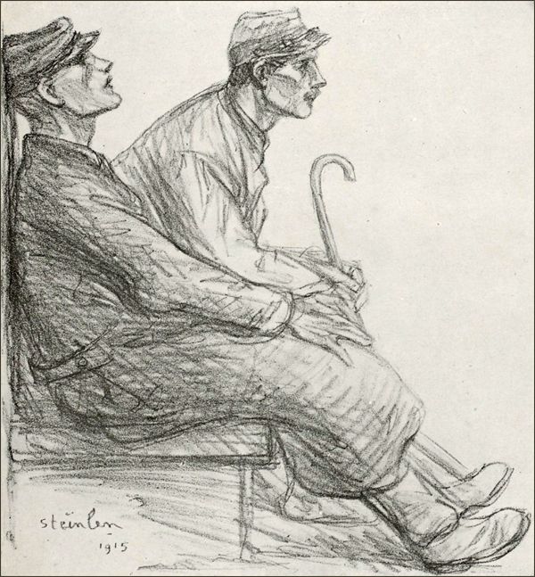On ne décrit pas un tel art, car il est lui-même une synthèse de la description littéraire, et il faudrait s’arrêter à chaque croquis. J’essaie moins de suggérer l’œuvre que d’en définir les directions en rendant un juste hommage à celui qui, de toute la science de son beau métier et de toute la sincérité de son cœur profond, l’a réalisée. C’est encore un des caractères de cette conception si spéciale que la grande préséance donnée par Steinlen, en ses séries, aux femmes et aux enfants. Il y en a beaucoup plus que de soldats. Par-dessus tout, un chef-d’œuvre d’art, de grâce triste et d’amour: le convalescent infirme, la béquille sous un bras, s’appuyant de l’autre sur une jeune femme aux grands voiles. Rien ne rendra par des mots le modelé de ce jeune corps féminin sous les étoffes et les expressions de ces deux visages, et la technique miraculeusement simple, n’intervenant juste que pour signifier le sentiment. Que cela est donc beau! Courageuse est encore une chose admirable, montrant auprès du soldat prêt à partir, la femme fière, raidie, s’interdisant de pleurer. Et c’est une autre admirable chose, simplifiée à l’extrême, que ce dessin des Convalescents, deux jeunes soldats dont l’un se courbe, accablé, sur sa canne, tandis que l’autre, maigre et livide, défaille à demi, la face vers le ciel, le dos appuyé au mur de l’hôpital. C’est encore ici une œuvre où les limites de la poésie, du roman et de l’art du dessin ne sont plus discernables, où l’émotion emprunte tous les moyens pour s’imposer, où on ne pense pas à ces moyens, où l’idée seule compte. Ce n’est qu’après qu’on se demande comment c’est fait, et quelle magie sort de ce bout de papier crayonné, de cette note de carnet.