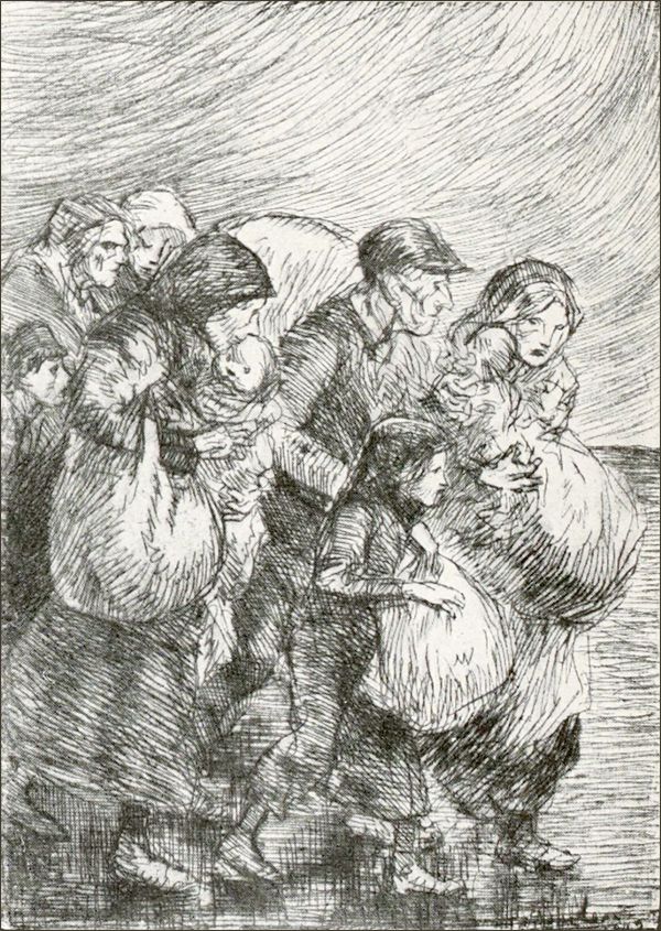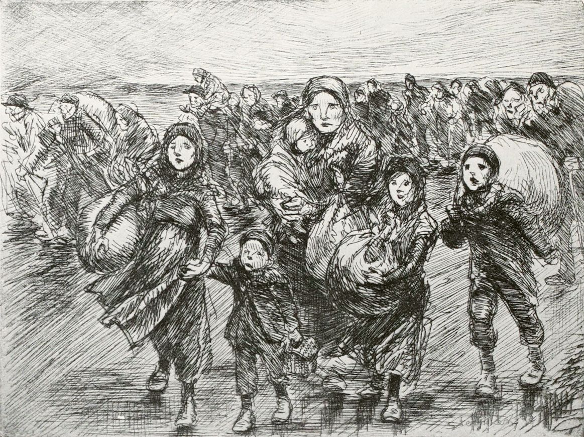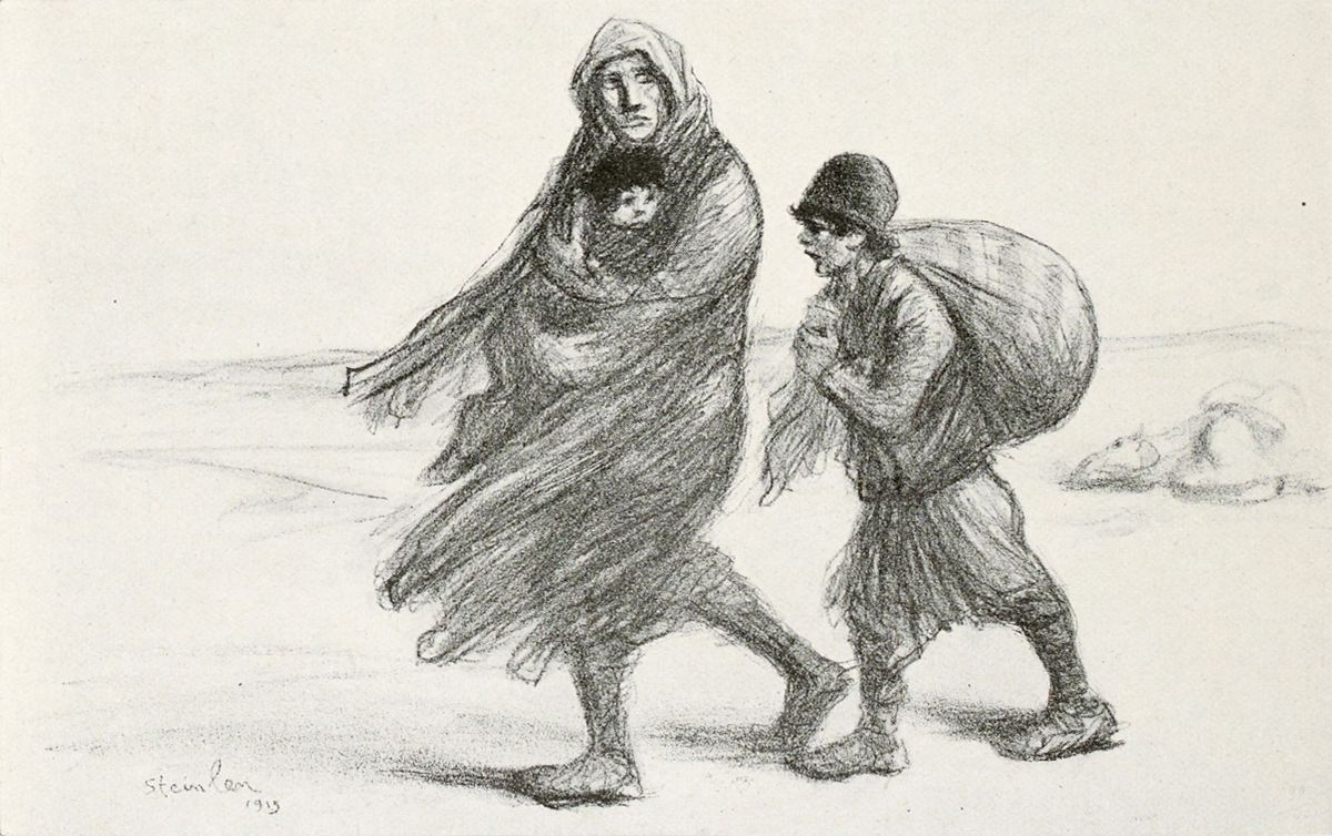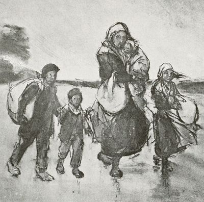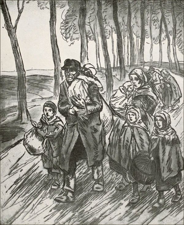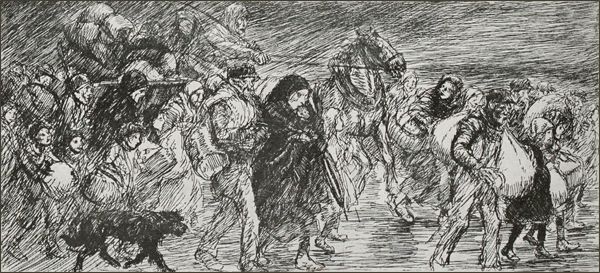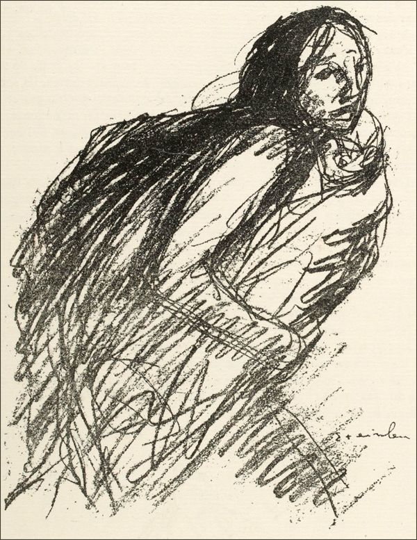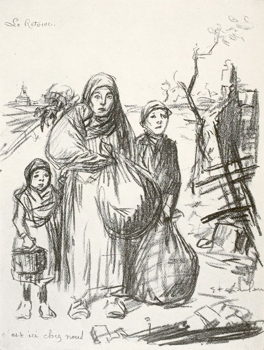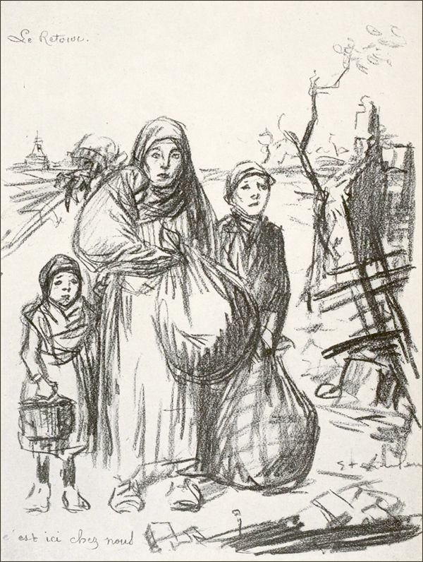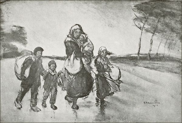 Steinlen, dans des camps de réfugiés, dans des centres d’évacuation, a dessiné des femmes et des enfants serbes, avec une force extraordinaire de caractère graphique: la fierté farouche, la mélancolie, la passivité de la race persécutée, massacrée et proscrite sont là tout entières. Steinlen a peint et dessiné, dans les wagons à bestiaux qu’éclaire un quinquet lamentable, le sommeil prostré des soldats recrus de lassitude, s’épaulant, offrant à la lueur trouble des masques ravinés, aux yeux gonflés, aux bouches tordues, béantes, pleines d’ombre. Il a peint, sur une route fangeuse, balayée par la rafale, le croisement des Deux Cortèges, celui des réfugiés qui cheminent avec leurs misérables hardes et celui des troupiers qui leur crient: «On les aura!» Il a vu et exprimé la paysanne et les gosses qui, navrés et stupéfaits, restent les bras ballants devant quelques pierres en murmurant: «C’est ici, chez nous!» Il a dressé, massive et sévère dans sa mante noire, la Vieille des Ruines, la petite bourgeoise respectable, correcte malgré tout avec sa capote et ses bandeaux plats, et dont toute la face est comme vitrifiée sous les larmes figées. Elle est au milieu des décombres, elle ne peut 33 même plus pleurer, elle n’a pas peur, rien ne l’intéresse, c’est une Niobé déjà insensibilisée dans la pierre, cette femme qui a tout souffert, tout vu, et que la mort physique a oubliée alors que son âme est morte depuis longtemps. Ah! Steinlen ne nous montre ni cavaliers, ni batteries, ni charges à la baïonnette, ni drapeaux, ni éclatements d’obus, et la formule de jadis est bien finie, mais comme il nous l’évoque tout de même, la guerre!