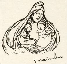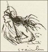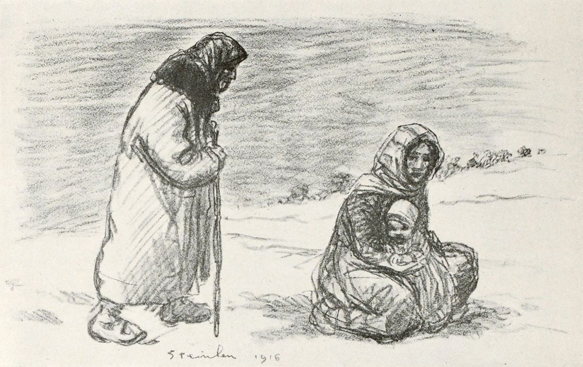 Resté en marge de toute école, de toute théorie, de toutes les tourmentes artistiques qui ont dévoyé récemment tant de talents et donné de l’importance à trop de maximalistes de la peinture, Steinlen est un grand observateur humain dont le cœur a parlé, dont le cœur a aimé ce que voyaient ses yeux, et qui, dans la vaste convulsion, est resté lui-même, plein de pitié clairvoyante. Il se sert magistralement des éléments naturels et éternels de son art, il suggère le sentiment par l’étude serrée puis largement synthétisée du visible, comme un Dickens du crayon: mais aussi avec une âpreté qui n’est point dans Dickens, une âpreté qui décèle la faculté d’indignation, sans laquelle la pitié n’est qu’une velléité inopérante. Toutes les haines sont restées en dehors de la conscience de cet homme à la voix douce, sauf la haine du Mal, et elle parle sourdement à travers ces dessins où il évoque les victimes, où les bourreaux sont invisibles et pourtant toujours présents. Et c’est pourquoi, dans cette guerre que nous faisons, et qui est la guerre faite au principe du Mal, une véritable croisade contre l’Antéchrist, l’artiste miséricordieux qu’est Steinlen est aussi un combattant.