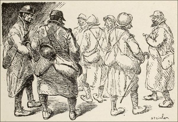 Le poilu de Steinlen, c’est surtout le réserviste à barbe grisonnante, le «pépère», l’ouvrier habitué à la pauvreté, à la laideur, au vacarme du faubourg et des agglomérations suburbaines, le travailleur résigné, honnête et franc que rien n’étonne, l’homme des peines que nulle corvée ne rebute, qui sait que, soldat ou tâcheron, sa vie ne pouvait être qu’une série de fatigues ignorées au service d’égoïsmes ingrats: et cette fois, du moins, il sait qu’elles sont au service d’une 24 grande idée très pure, et cela le console et le soutient. Cet être-là, musclé et tranquille, reçoit sur son large dos l’averse des maux comme il reçoit l’averse du ciel; et si la pluie des balles s’y mêle, il n’a ni surprise, ni peur. Au front, dans le dédale des tranchées et dans l’énorme machinerie des services techniques, il est un numéro vivant, comme à l’usine. Cela n’altère ni sa résolution, ni sa philosophie, ni sa bonne humeur, ni ses petites joies. Il est le brave homme de misère. Steinlen, l’admirable dessinateur, psychologue de Crainquebille, s’est souvenu de son Crainquebille devant ces vieux réservistes plébéiens qui ont «tenu» à Verdun, au bois Le Prêtre, dans les boues sinistres de la Somme: c’est toujours Crainquebille, avec son bon sourire désabusé sous sa grosse moustache d’où surgit la pipe consolatrice. Crainquebille ne pousse plus la voiture, il a pris le fusil, voilà tout, et il peine parce que c’est son habitude, qu’il est né pour ça, que le monde a toujours marché à cause de l’éreintement mal payé de tous les Crainquebilles—mais c’est pour la France, pour la ménagère et les marmots autant que pour les bourgeois et les poupées du beau monde, et c’est pourquoi Crainquebille devenu poilu est malgré tout content.