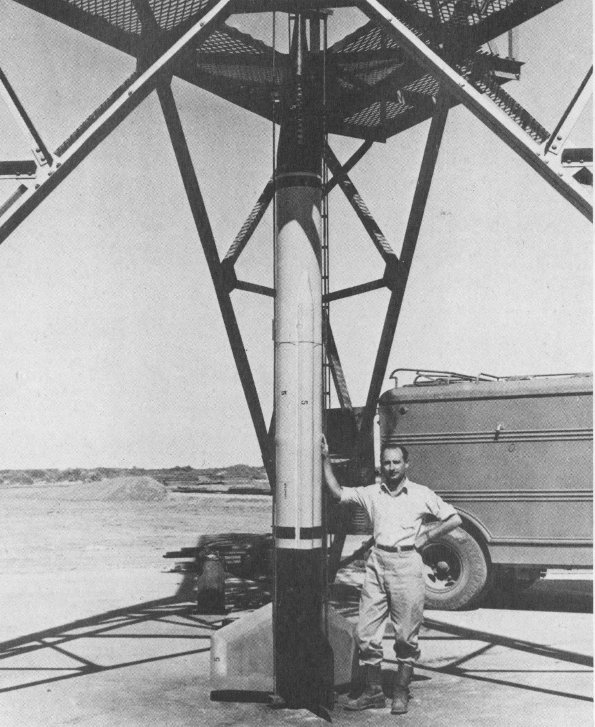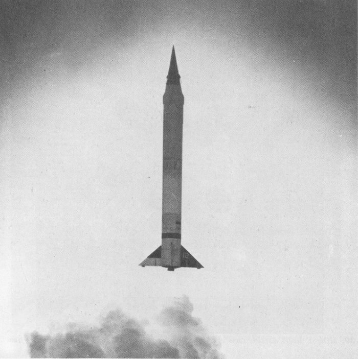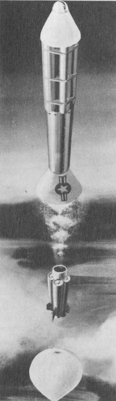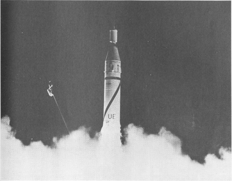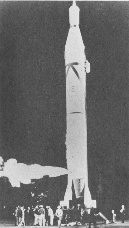 5. Trial firing of a full-size mockup of Explorer 1 on the third-stage assembly of the Jupiter-C launch vehicle.