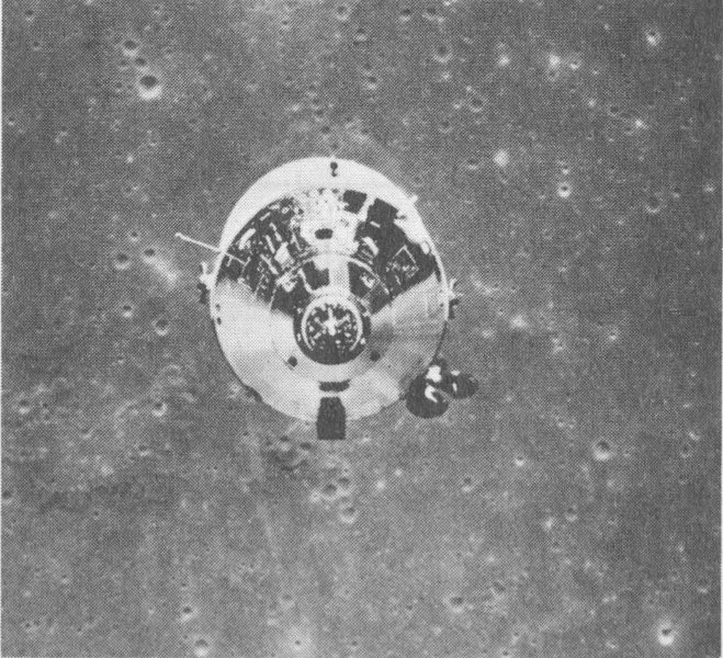 14. View of the Apollo 11 Command Module with Astronaut Collins aboard as seen from the Lunar Module. Terrain in background is the far side of the Moon.