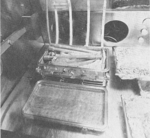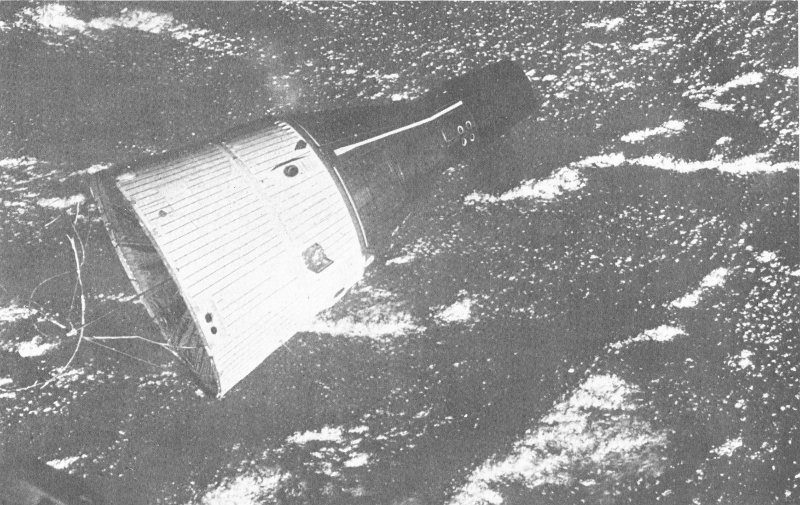 13. Three inflated bags repositioned the spacecraft following splashdown. The astronauts watch pararescue-man shut hatch during recovery.
