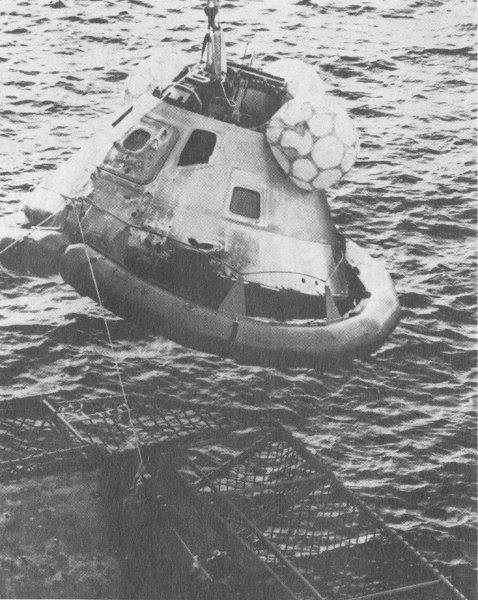Splashdown occurred in the central Pacific Ocean on July 24. The astronauts climbed out of this command module and were recovered by helicopters that took them to the carrier U.S.S. Hornet.