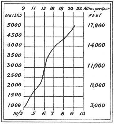 The Ascent.—The tractor was headed into a 30-mile northwesterly wind so that the “take-off” was quick and easy; there were only a few seconds spent rolling over the field, when the airplane left the ground and I felt the never to be forgotten cushioning feeling of the air. For ten seconds there was experienced a decidedly weakening nervous chill, which occurred to me once before when making a high dive from a spring-board. It was the sort of physiological disturbance that can only be counteracted by immediately pulling one’s self together saying, “Well, here goes nothing!” The momentary depression was immediately followed by a corresponding elation of feeling which strange to say did not leave me during the trip and is always associated with thoughts of the journey. There was no dizziness, although I am peculiarly susceptible to the least change in balance. The earth did not recede as we progressed steadily19 upward; we seemed part of the earth, but not of it. Although the airplane reached an altitude of 3,000 feet in a comparatively few minutes, the barometer falling from 30.0 to 27.0 inches, the decreased bodily pressure was not at all noticeable.H