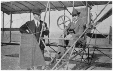 Next to the supporting quality of the atmosphere I had noticed the 70-mile blast of air as the airplane pushed its way steadily onward and upward. Naturally, the exhaust of the motor in addition to the roar of the wind made conversation impossible. Some airplanes have telephone communication between observer and pilot. (See Fig. 9.) During one flight in a machine not so equipped, the passenger noticed the breaking of some apparatus. Knowing that it was impossible to make himself heard he hastily scribbled the word “Accident!” on a bit of card, whereupon the pilot shut off his engine and glided to earth.