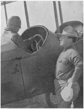 Instructor Oscar Brindley and the observer, Meteorologist Ford A. Carpenter, U. S. Weather Bureau, leaving the ground for a flight. In the military tractor used generally by the Army, the observer sits forward while the pilot occupies the after cockpit. This machine, like all others used in the military service, has dual control.