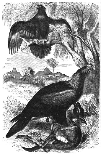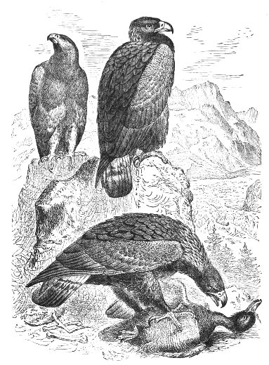 THE EAGLES (Aquila):—The Tawny Eagle—The Golden Eagle—The Imperial Eagle—The Spotted Eagle. The DWARF EAGLES (Hieraëtos):—The Booted Eagle—The Dwarf Eagle. The WEDGE-TAILED EAGLES (Uroaëtos):—The Bold Wedge-tailed Eagle. The HAWK EAGLES (Pseudaëtos, Eudolmaëtos, or Asturaëtos):—Bonelli's Hawk Eagle. The HOODED EAGLES (Spizaëtos):—The Martial Hooded Eagle—The Tufted Eagle. The DESTROYING EAGLES (Pternura):—The Urutaurana. The BRAZILIAN EAGLES (Morphnus):—The Crested Brazilian Eagle—The Harpy Eagle. The SEA EAGLES (Haliaëtos):—The Sea Eagle—The White-headed Sea Eagle—The African Screaming Sea Eagle—The Osprey, River Eagle, or Fish Hawk 7-31