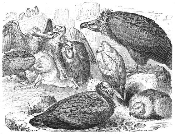 THE VULTURES (Vulturidæ):—The Bearded Vulture. The TRUE VULTURES (Vultur). The CONDORS, or WATTLED VULTURES (Sarcorhamphus):—The Condor—The Californian Condor—The King of the Vultures. The GOOSE VULTURES (Gyps):—The Tawny Goose Vulture—The Sparrow-hawk Goose Vulture. The CRESTED VULTURES:—The Cowled Vulture—The Variegated or Crested Vulture. The EARED VULTURES (Otogyps). The RAVEN VULTURES (Catharta):—The Scavenger or Egyptian Raven[Pg iv] Vulture—The Monk Vulture—The Urubu or Turkey Buzzard—The Gallinazo 64-84