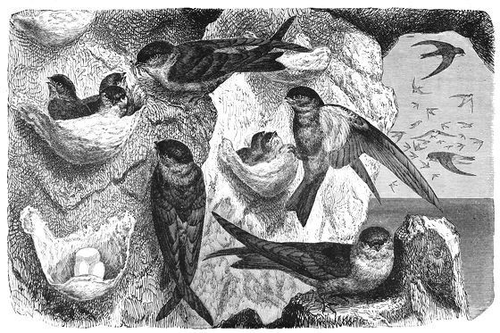 THE SWIFTS (Cypselus). The TREE SWIFTS (Dendrochelidon):—The Klecho. The SALANGANES (Collocalia):—The Salangane Proper—The Kusappi. The PRICKLY-TAILED SWIFTS (Acanthylis):—The White-throated Prickly-tailed Swift—The Dwarf Swift—The Palm-tree Swift—The Steeple Swift—The Alpine Swift 115-124
