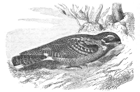 THE NIGHT JARS, or GOATSUCKERS (Caprimulgus):—The Nacunda. The TWILIGHT NIGHT JARS (Chordeiles):—The Night Falcon—The Common Goatsucker—The Resplendent Goatsucker. The BRISTLED NIGHT JARS (Antrostomus):—The Whip-poor-Will. The AFRICAN NIGHT JARS (Scotornis). The LYRE-TAILED NIGHT JARS (Hydropsalis):—The Lyre-tailed Night Jar. MACRODIPTERYX:—The Long-winged Macrodipteryx—The Streamer-bearing Night Jar, or "Four Wings." The GIANT GOATSUCKERS (Nyctibius):—The Ibijau, or Earth-eater—The Guachero, or Oil Bird. The OWL SWALLOWS (Podargus):—The DWARF OWL SWALLOWS (Ægotheles):—The True Dwarf Owl Swallow. The GIANT OWL SWALLOWS (Podargus):—The Giant Owl Swallow. The FROG-MOUTHS (Batrachostomus):—The Plumed Frog-mouth 124-140