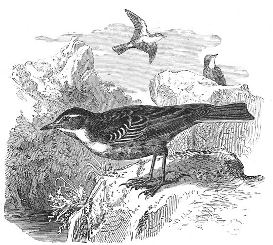 THE WARBLERS (Monticola). The REDSTARTS (Ruticilla):—The Black-capped Redstart—The Garden Redstart. The MEADOW WARBLERS (Pratincola):—The Brown-throated Meadow Warbler—The Black-throated Meadow Warbler. The CLIPPERS (Ephthianura):—The Wagtail Clipper. The CHATS (Saxicola):—The Fallow Chat, or Wheatear—The Eared Stone Chat and Black-throated Stone Chat. The RUNNING WARBLERS (Dromolæa):—The White-tailed Wheatear. The STONE THRUSHES, or ROCK WAGTAILS (Petrocincla):—The Stone Thrush, or Rock Wagtail—The Blue Rock Wagtail, or Blue Thrush—The Bush Warbler 193-204