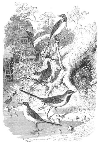 THE WAGTAILS (Motacilla):—The White Wagtail—The Pied Wagtail—The Dhobin—The Rock Wagtail—The Mountain Wagtail. The SHEEP WAGTAILS (Budytes):—The Cow or Meadow Wagtail—Ray's Wagtail—The Velvet-headed or Sheep Wagtail—The Yellow-headed Wagtail—The Gomarita, or Garden Wagtail. The SWALLOW WAGTAILS (Enicurus):—The MENINTING 282-292