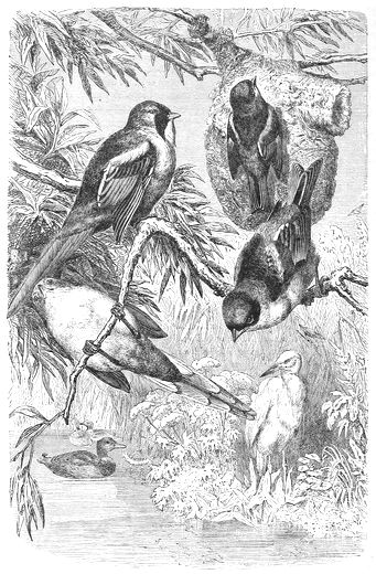 THE FLY-CATCHERS. The KING or TYRANT SHRIKES (Tyrannus):—The True Tyrant Shrike, King Bird, or Tyrant Fly-catcher—The Bentevi. The FORK-TAILED TYRANTS (Milvulus):—The Scissor Bird—The Royal Tyrant. The STILTED FLY-CATCHERS (Fluvicola):—The Yiperu, or Yetapa—The Cock-tailed Fly-catcher. The CATERPILLAR EATERS (Campephaga):—The Red Bird, or Great Pericrocotus. The FLY-SNAPPERS (Myiagra). The PARADISE FLY-CATCHERS:—The Paradise or Royal Fly-snapper. The FANTAILS (Rhipidura):—The Wagtail Fantail. The TRUE FLY-CATCHERS (Muscicapa):—The Grey or Spotted Fly-catcher. The MOURNING FLY-CATCHERS (Muscicapa):—The Black-capped or Pied Fly-catcher—The Collared or White-necked Fly-catcher—The Dwarf Fly-catcher. The SILK-TAILS (Bombycilla):—The European, or Common Silk-tail, Bohemian Chatterer, or Wax-wing 158-174