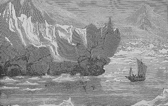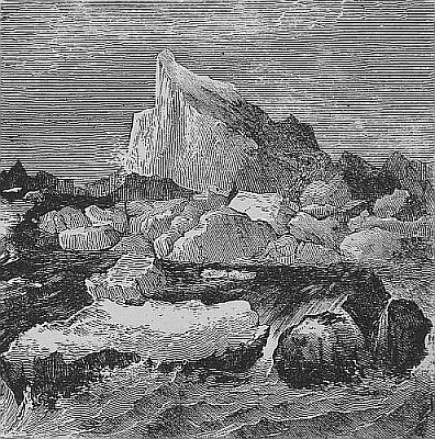 Whence come these mighty masses? They are discharged from the frozen rivers of the North, the great glaciers that line the west coast of Greenland and the shores of Iceland. The constant snows of the arctic regions falling on the mountains and drifting into the valleys, solidify into mighty glaciers which, pent in by the rocky hills, come sweeping through the winding valleys to the sea. Great as are the glaciers of the Alps, they are but pigmies compared with those of Greenland. The Tyndall glacier where it discharges into the sea is two miles in width;—but [Pg 41]grand above all is the great Humboldt glacier, whose lofty face reaches three hundred feet above the sea level and beneath it to an unknown depth, while it is over sixty miles in width. Slowly but steadily this whole mass is pushed forward. The angle at which it descends from the hills soon forces under the water a greater part of the ice than would be submerged were it floating unattached, and the natural buoyancy of the ice causes it to break loose with a thundering report. Splashing and plunging, it finally rights itself and goes majestically sailing on borne by the currents, till melted by the warmer waters of the Atlantic it finally disappears entirely.