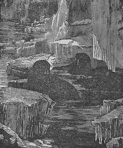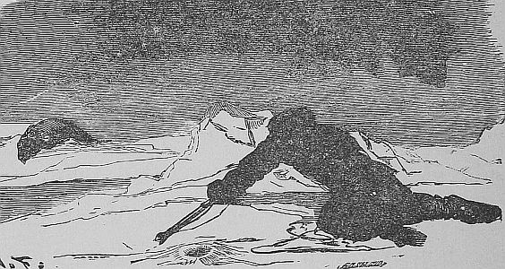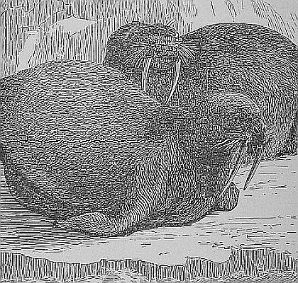 “It seemed to be the purpose of the walrus to get their tusks over the gunwale of the boat, and it was evident that in the event of one such monster hooking to us, the boat would be torn in pieces and we would be left floating in the sea helpless. We had good motive therefore to be active. Miller plied his lance from the bows and gave many a serious wound. The men pushed back the onset with their oars while Knorr, Jensen and myself, loaded and fired our rifles as rapidly as we could. Several times we were in jeopardy, but the timely thrust of an oar or the lance or a bullet saved us. Once I thought we were surely gone. I had fired and was hastening to load; a wicked looking brute was making at us, and it seemed probable [Pg 59]that he would be upon us. I stopped loading and was preparing to cram my rifle down his throat, when Knorr who had got ready his weapon sent a fatal shot into his head. Again an immense animal, the largest I had ever seen, and with tusks apparently three feet long, was observed to be making his way through the herd with mouth wide open, bellowing dreadfully. I was now as before busy loading: Knorr and Jensen had just discharged their pieces, and the men were well engaged with their oars. It was a critical moment, but happily I was in time. The monster his head high above the water was within two feet of the gunwale when I raised my piece and fired into his mouth. The discharge killed him instantly, and he went down like a stone. This ended the fray. I know not why, but the whole herd [Pg 60]seemed suddenly to take alarm, and all dove down with a tremendous splash almost at the same instant. When they came up again, still shrieking as before, they were some distance from the shore, their heads now all pointing seaward making from us as fast as they could go, their cries growing more and more faint, as they retreated in the distance.”