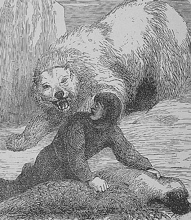 It is hard to know whether to class the Polar bear among land animals or sea animals. He is a capital swimmer, and can make headway in the waves at the rate of three miles an hour. Dr. Hayes found one swimming in the open ocean, completely beyond sight of land or ice; evidently he had been carried to sea on some floe which had crumbled beneath him. The Esquimaux hunt them with dogs which are trained to attract their attention [Pg 63]in front, till the hunter can plunge his lance into their side. A skilful man can thus often kill a bear at a single blow, but it is no rare thing for him to have to leave his lance sticking in the animal’s side to take refuge in flight. A very ingenious way, which is sometimes tried, is to take a very stiff piece of whalebone, some two inches wide and four feet long. This is with much labor coiled into a narrow space and then covered with blubber, which being frozen holds the whalebone in its place. Approaching a bear they hurl a spear at him, and when he turns to pursue they drop the frozen mass before him, which he speedily swallows. The heat of the body soon dissolves the blubber, and the whalebone being set free springs back with great violence, tearing the stomach in such a way as to cause speedy death. The [Pg 64]bear is very fond of seal, and is almost as expert a hunter of them as the Esquimaux. Captain McClintock tells of the adventure of an Esquimau with one of these bears. He [Pg 65]was kneeling on the ice and had just drawn up his net in which a seal was caught, when he felt a blow upon the shoulder. Fancying that it was his companion he paid no attention to it, but a heavier blow caused him to turn, when he found beside him an enormous bear, who tearing the seal from the net deliberately proceeded to eat it. Our friend did not dispute his right, but lost no time in seeking more comfortable quarters.