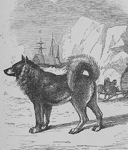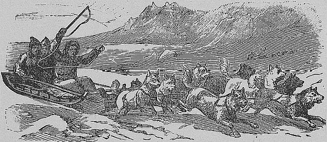 When the Esquimau wishes to travel, he fastens his dogs to a light sledge by long traces, and whip in hand with his fur skins drawn about him takes his seat upon it, and [Pg 78]is whirled over the snow at tremendous speed. His whip is a curious affair. From the end of a stock only about a foot long, extends a lash of some twenty feet. Woe to the unfortunate driver who does not know how to use this lash, and to be able to bring a resounding blow on the ear of an unruly dog. The fresh track of a bear is scented and the whole pack is away like a whirlwind, while the rider tumbled off his sledge by collision with some hummock of ice is left to get home on foot as best he can. Dr. Hayes tells of his experience. “The wind was blowing at my back, and when I had gone far enough and wanted to turn around and return, the dogs were not so minded. There is nothing they dislike so much as to face the wind, and feeling very fresh they were evidently ready for sport. [Pg 79]After much difficulty I brought them at last up to the course, but I could keep them there only by constant use of the lash, and since this was three out of four times blown back into my face, it was evident I could not hold out long, besides my face was freezing in the wind. My arm, not used to such violent exercise, soon fell almost paralyzed, and the whip-lash trailed behind me on the snow. The dogs were not slow to discover something wrong. They looked back over their shoulders inquiringly, and discovering that the lash was not coming they ventured to diverge gently to the right. Finding the effort not resisted they gained courage, and increased their speed, and at length they wheeled short round, turned their tails to the wind and dashed off on their own course, as happy as a parcel of boys freed from the [Pg 80]restraints of the school-room, and with the wild rush of a dozen wolves. I could soon again use the whip, and managed to turn the intractable team among a cluster of hummocks and snow drifts, which somewhat impeded their progress. Springing suddenly off, I capsized the sledge. The points of the [Pg 81]runners were driven deeply into the snow, and my runaways were anchored. A vigorous application of my sinew-tipped lash, soon convinced them of the advantages of obedience, and they trotted off in the meekest manner facing the wind without rebelling.”