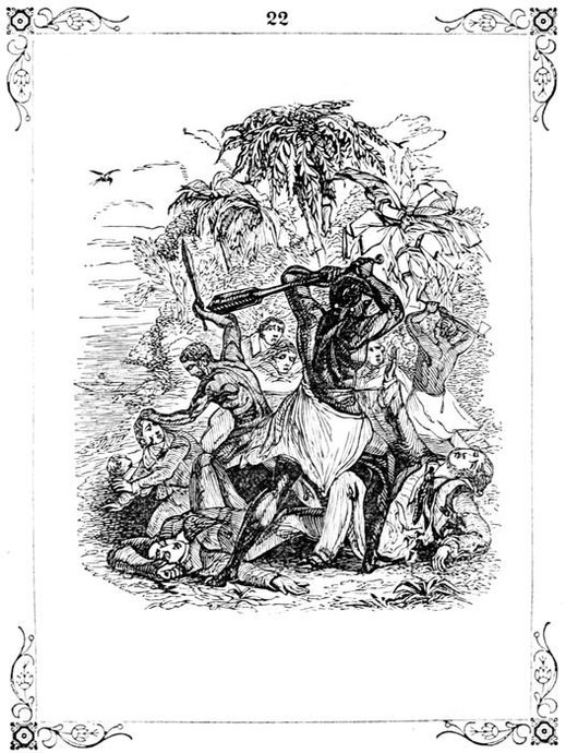Not very far off, the other savages were dancing round a large fire, before which they had placed in a row, the heads of our unfortunate companions, whose bodies, after being stripped of their clothes, were left on the beach, and I should think the tide soon washed them away, for I never saw them afterwards. From these heads, I saw the savages, every now and then, cut pieces of flesh from the cheeks, and pluck out the eyes, and eat them, shouting most hideously. This, I afterwards learned, it was the custom of these islanders to do with their prisoners; they think that it will give them courage, and excite them to revenge themselves upon their enemies.