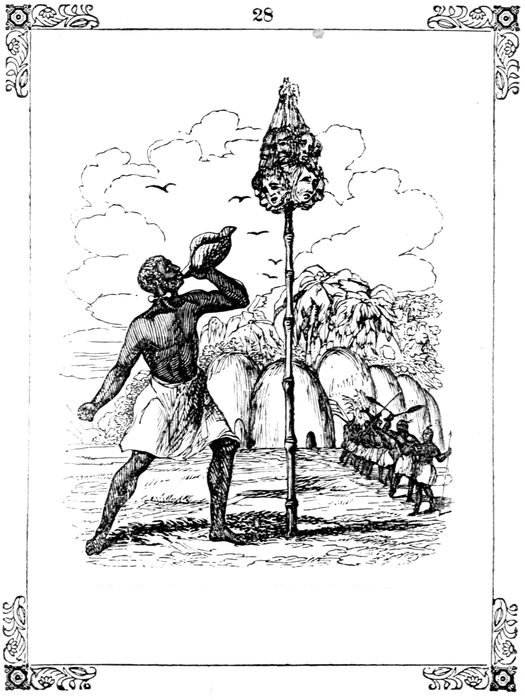 Every morning about sunrise, and every evening at sunset, one of the natives went close to the pole, and blew seven or eight times through a large shell; which made a noise somewhat like blowing through a cow’s horn; at the same time looking up steadfastly at the heads.