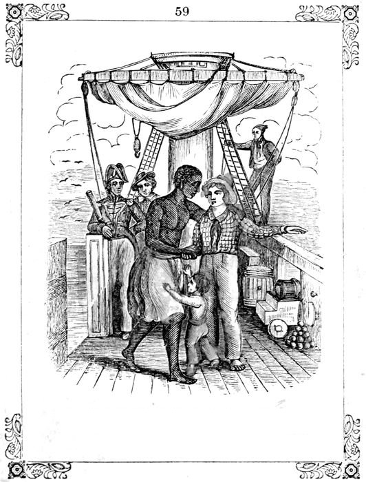 About the 19th of December, we left the dock, with a cargo mostly of lead and calico. Our crew consisted of the following persons: Frederick Moore, commander; Robert Clare, chief mate; William Major, second mate, Messrs. Ching and Perry, midshipmen; Mr. Grant, surgeon: Mr. Williams, sail-maker; William Montgomery, steward; Lawrence Constantyne, carpenter; 4Thomas Everitt, boatswain; John Barry, George Lawn, James Millar, James Moore, John Carr, Francis Hower, William Jefferies, Samuel Baylett, Charles Robertson, and Francis Quill, seamen; and John Sexton, and myself, boys. The passengers were, Mr. Armstrong, a native of Ireland, and twenty-five male and female children from the Emigration Society, with some other steerage passengers.