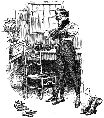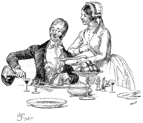 One day, at a select party in his honour, which Miss Pole gave, and from which, as Mrs. Jamieson honoured it with her presence, and had even offered to send Mr. Mulliner to wait, Mr. and Mrs. Hoggins and Mrs. Fitz-Adam were necessarily excluded—one day at Miss Pole’s, Mr. Peter said he was tired of sitting upright against the hard-backed uneasy chairs, and asked if he might not indulge himself in sitting cross-legged. Miss Pole’s consent was eagerly given, and down he went with the utmost gravity. But when Miss Pole asked me, in an audible whisper, ‘if he did not remind me of the Father of the Faithful?’ I could not help thinking of poor Simon Jones, the lame tailor; and while Mrs. Jamieson slowly commented on the elegance and convenience of the attitude, I remembered how we had all followed that lady’s lead in condemning Mr. Hoggins for vulgarity because he simply crossed his legs as he sat still on his chair. Many of Mr. Peter’s ways of eating were a little strange amongst such ladies as Miss Pole, and Miss Matty, and Mrs. Jamieson, especially when I recollected the untasted green peas and two-pronged forks at poor Mr. Holbrook’s dinner.