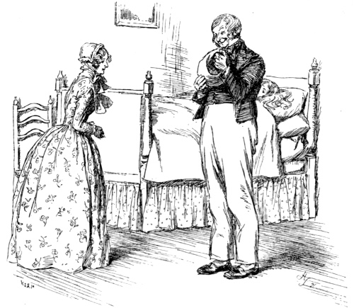 But I was right. I think that must be an hereditary quality, for my father says he is scarcely ever wrong. One morning, within a week after I arrived, I went to call Miss Matty, with a little bundle of flannel in my arms. She was very much awestruck when I showed her what it was, and asked for her spectacles off the dressing-table, and looked at it curiously, with a sort of tender wonder at its small perfection of parts. She could not banish the thought of the surprise all day, but went about on tiptoe, and was very silent. But 276she stole up to see Martha, and they both cried with joy, and she got into a complimentary speech to Jem, and did not know how to get out of it again, and was only extricated from her dilemma by the sound of the shop-bell, which was an equal relief to the shy, proud, honest Jem, who shook my hand so vigorously when I congratulated him, that I think I feel the pain of it yet.