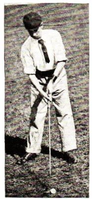 The proper grip was illustrated in last week's paper. It is not the natural position for the hands when at rest, but experience has decided that it is the best for the swing. In particular the left hand should be well over the club, or freedom of motion is impossible. Get your grip by grasping the club as though you were about to strike a blow straight down upon an anvil, and then swing gently two or three times directly over the ball, describing a flourish that shall resemble an elongated eight. This is called the "waggle," and its purpose is to assist the hands to settle into position. Finally ground the club close behind the ball for an instant, and then swing back for the real business of the stroke. About an inch of the shaft should be left above the grip to give greater command over the club. The thumb may lie along the shaft or be wrapped around it, or one thumb may be around and the other along the handle. In any case the grip of the left hand must be absolutely firm and close so that there may be no possibility of the club turning at the moment of impact. The right hand may be comparatively loose, but, generally speaking, that hand will take care of itself. Finally, keep the left wrist as taut as possible, and remember that every inch that separates your hands on the shaft takes off yards from the length of the drive. Let the arms be naturally bent, and keep your hands low. The end of the shaft should point well below the waistcoat.