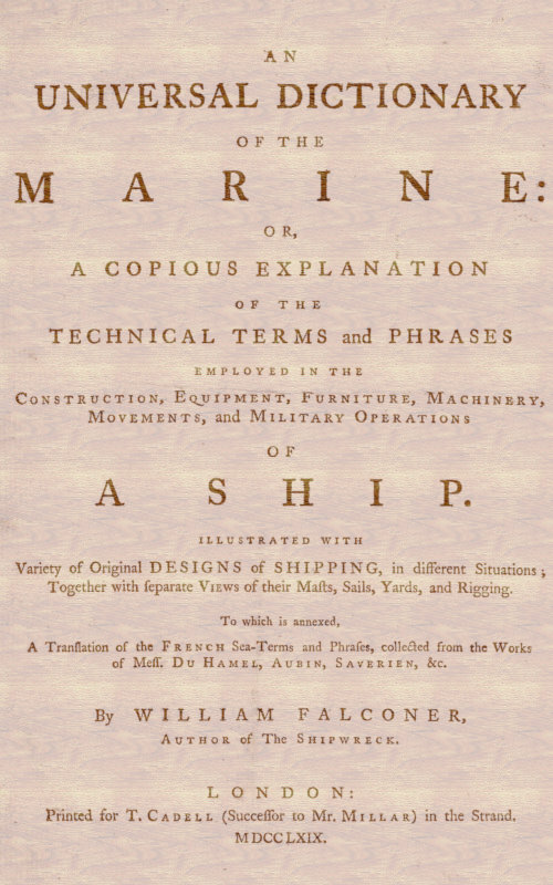 The following work has engaged my utmost application for some years. Several performances on the same subject have already appeared; as Sir H. Manwaring’s Seaman’s Dictionary; Boteler’s Sea Dialogues; Guillet’s Gentleman’s Dictionary, and Blanckley’s Naval Expositor, &c. Far from exhibiting an enlarged and comprehensive view of naval affairs, these productions are extremely imperfect, according to the very circumscribed plan which their authors have adopted. There are besides, the Dictionaire de Marine of M. Aubin, published in Holland; and that of M. Saverien, published in France. These are indeed voluminous, but very deficient in the most necessary articles. Besides a circumstantial detail of the local oeconomy of different marine departments, they are swelled out with astronomy, navigation, hydrography, natural history, &c. all of which are abundantly better treated in other compositions. Of the machinery of a ship; the disposition of the rigging on her masts and yards; and the comparative force of her different mechanical powers, their accounts however are often vague, perplexed, and unintelligible.