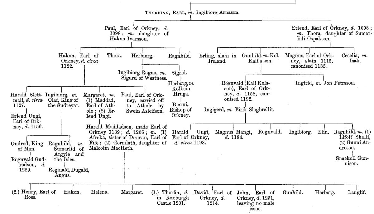 The Orkneyinga Saga is the history of the Orkneymen, Earls and Odallers of Norwegian extraction, who established an Earldom of Norway in the Northern Scottish Isles a thousand years ago, and whose descendants for several centuries held sway over the Hebrides and Northern Mainland of Scotland. Commencing with the conquest of the Isles by Harald Harfagri, the Saga relates the subsequent history of the Earldom of Orkney under the long line of its Norse Jarls, and is, for a period of three centuries and a half, the principal authority for the history of Northern Scotland. The narrative is mainly personal, and therefore picturesque, pourtraying the men in person and character, impartially recording their deeds, and mentioning what was thought of them and their actions at the time. Occasionally the Saga-writer is enabled to do this in the words of a contemporary Skald. The skaldic songs, so often quoted, were the materials from which the Sagas were subsequently elaborated. In estimating their value as historical materials, it must be borne in mind that all history has begun in song. When great events and mighty deeds were preserved for posterity by oral recitation alone, it was necessary that the memory should be enabled to retain its hold of the elements of the story by some extraneous artistic aid, and therefore they were welded by the word-smith’s rhymes into a compact and homogeneous “lay.” Thus, worked into a poetical setting (as the jeweller mounts ivhis gems to enhance their value and ensure their preservation), they passed as heirlooms from generation to generation, floating on the oral tradition of the people. Snorri Sturluson tells us that the songs of the skalds who were with Harald Harfagri in his wars were known and recited in his day, after an interval of nearly four centuries. “These songs,” he says, “which were sung in the presence of kings and chiefs, or of their sons, are the materials of our history; what they tell of their deeds and battles we take for truth; for though the skalds did no doubt praise those in whose presence they stood, yet no one would dare to relate to a chief what he and those who heard it knew to be wholly imaginary or false, as that would not be praise but mockery.” Our earliest Scottish chroniclers did not disdain to make use of the lay-smith’s craft, as a help to history, long after the Iceland skald had been succeeded by the Saga-writer, and the flowery recitative of an unclerkly age superseded by the terser narrative of the parchment scribe. The art is as old as Odin and the gods, if indeed it be not older, and these its creations. But its golden age had passed ere Paganism began to give way before Christianity, and the specimens we have in this Saga are mostly of the period of its decadence and by inferior skalds. Yet it is significant of the esteem in which the art continued to be held by the settlers in the Orkneys, that we find Earl Sigurd honouring Gunnlaug Ormstunga with princely gifts, Arnor Jarlaskald enjoying the special favour and friendship of Earl Thorfinn, and Earl Rögnvald, the founder of the cathedral, courting for himself the reputation of an accomplished skald.