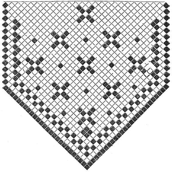 1st row—Fill the needle with scarlet or black wool, and commence in the 10th stitch of the last row, counting from the end; then, with No. 10 mesh net these 10 stitches, then 12 stitches on the slanting side of the edge, 12 stitches on the other side, and 10 stitches on the 1st row; turn back.