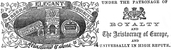 Is a delightfully Fragrant and Transparent Preparation for the Hair, and as an invigorator and beautifier, beyond all precedent. It bestows a permanent gloss, with a silky softness, and a strong tendency to curl, and is THE ONLY KNOWN SPECIFIC capable of effectually sustaining the hair in decorative attractiveness during the exercise of dancing, or the relaxing effects of crowded rooms. Price 3s. 6d. and 7s.; Family Bottles (equal to four small), 10s. 6d.; and double that size, 21s. per bottle.
