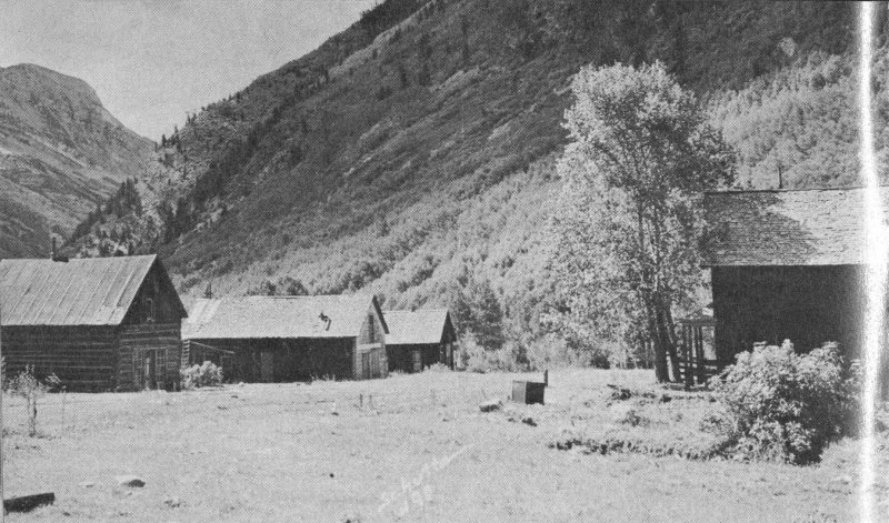 One half mile beyond the junction of the North Fork with the Crystal River it reaches the little hamlet of Crystal City, magnificently located in a small dale surrounded by several lofty peaks: Sheep Mountain, Mineral Point, Crystal Peak, Bear Mountain (the one covered with tall pines), White House, and Treasure Peaks. Crystal City was another typical mining town of 70 houses, several general stores, a school house (still standing), Crystal Club (still standing) and several other saloons, a newspaper—The Silver Lance followed by The Crystal River Current (still standing), a concentration mill and a smelter. The peak of its population was about 650 inhabitants (some say 2,000). While a railroad was never completed from Crested Butte, a telegraph line was installed. John Davisson, now of 855 Elm St., Grand Junction, Colo., patrolled this line on snowshoes as “trouble shooter” during the Winters of 1906-’07-’08.