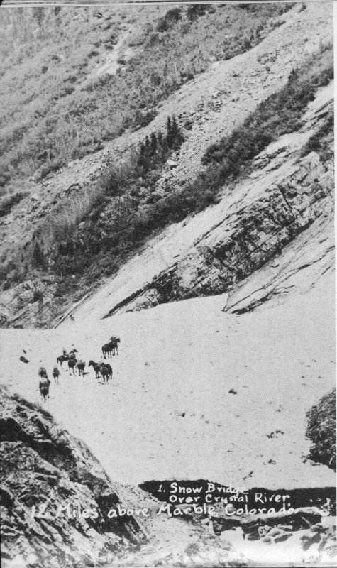 SNOW BRIDGE—across the Crystal River below the Devil’s Punch Bowls. It usually melts by September, but has been known to stay the year ’round. It is caused by slides on each side of the Canyon. —Photo courtesy John B. Schutte, Glenwood Springs, Colo.