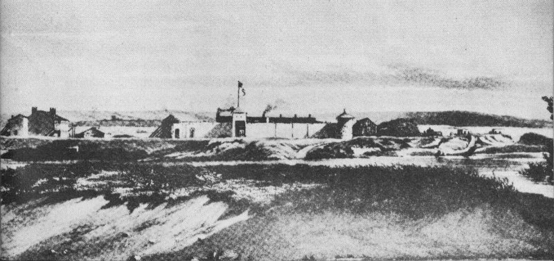 Fort William, the first Fort Laramie, in 1837. From a painting by A. J. Miller. Courtesy Mrs. Clyde Porter.