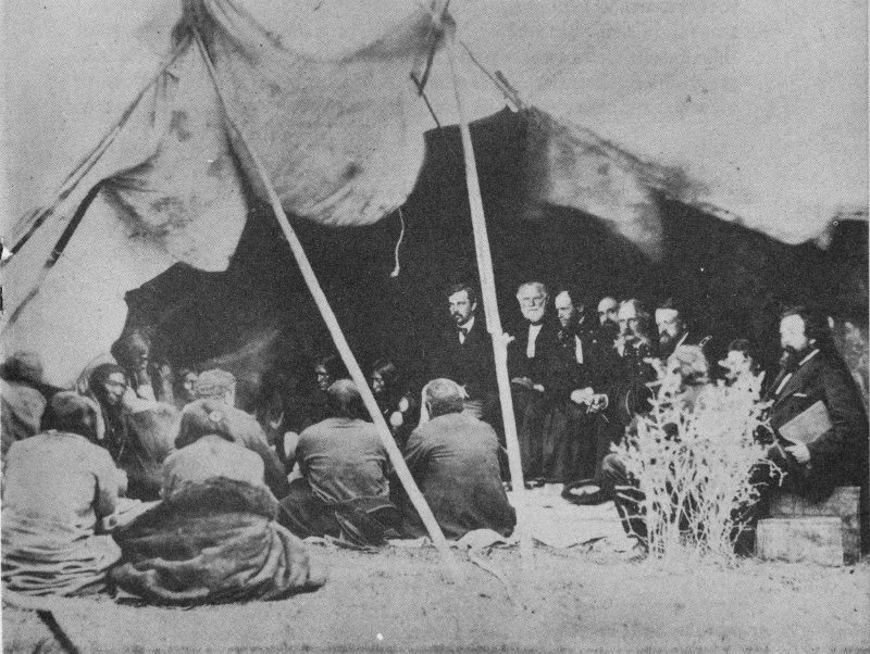 Early in 1851, the Congress had authorized holding a great treaty council with the Plains Indians to assure peaceful relations along the trails to the West. D. D. Mitchell and Thomas Fitzpatrick, the commissioners, chose Fort Laramie as the meeting place and summoned the various Indian tribes to come in by September 1. For days before that date, Indians gathered at the fort. The Sioux, Cheyennes, and Arapahoes mingled freely, but tension mounted as their enemies, the Snakes and Crows, made their appearance. Peace prevailed, however, and the sole major difficulties were a grazing problem and the late arrival of a wagon train of gifts. The countless ponies accompanying 10,000 Indians required so much forage that the vast assemblage had to move to the meadows at the mouth of Horse Creek, 30 miles east of the fort. Chiefs representing many other tribes arrived. Parades of Indian hordes in full array were held, speeches made, presents distributed, the pipe of peace smoked, and by September 17 it had been agreed that peace should reign among the red men and between them and the whites. The white men were to be free to travel the roads and hold their scattered forts, and the Indians were to receive an annuity of $50,000 in goods each year. The council was considered a great success and gave promise of a lasting peace on the plains.