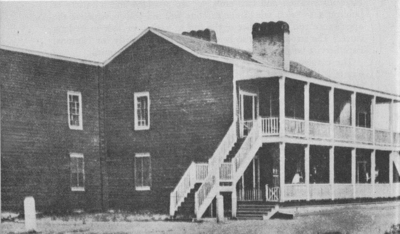 While purchase of the adobe trading post provided the Army with a measure of shelter for men and supplies, it was far from adequate. In late June 1849, Major Sanderson reported that the entire command was already employed in cutting and hauling timber and burning lime. Stone was also quarried and a horse-powered sawmill placed in operation. By winter, a two-storied block of officers’ quarters (to become known as “Old Bedlam”), a block of soldiers’ quarters, a bakery, and two stables had been pushed near enough completion to be occupied.