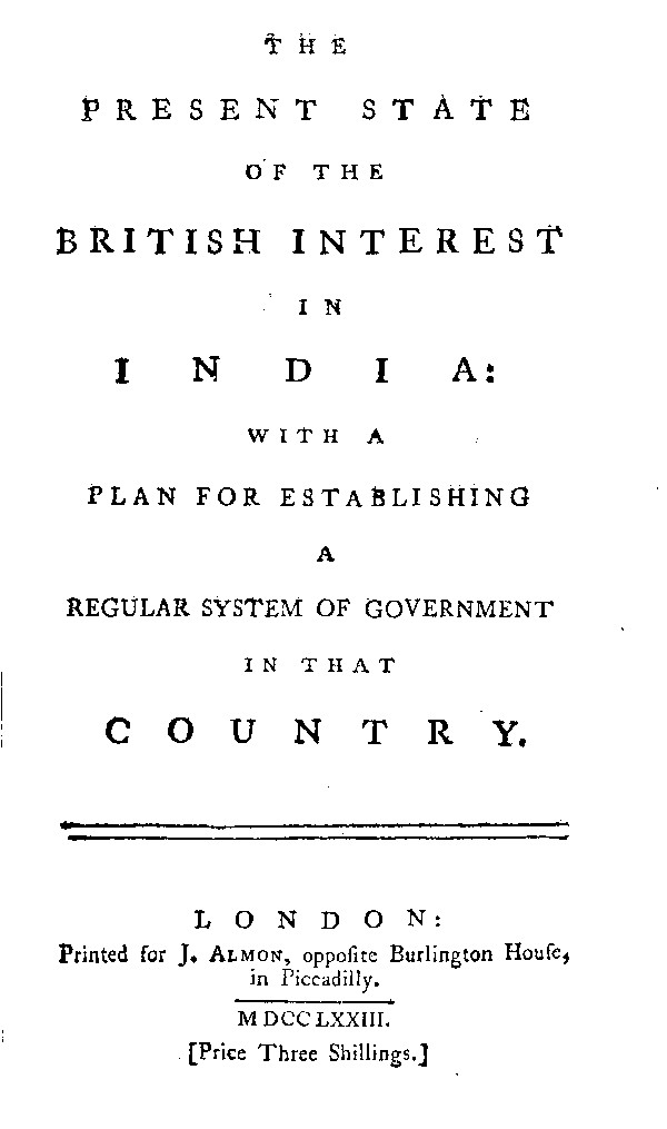 And we doubt not, that what hath been said will enable every one, who makes use of his own reason and reflection, to form a proper judgment for himself on certain points of this East India business, which have been most grossly misrepresented. For he will thereby discover, that the object, for which the nation hath to apprehend at present, is not the “credit of the Company;” which, had she been restrained within her natural sphere, and her conduct properly inspected by government, could never have been injured; or, if it had, the breach could (in such case) have 44little more affected the general weal, than the failure of any large trading house; which, so long as the trade remained entire, would have been immediately replaced by another; but he will perceive, that the present bad state of the Company’s credit is only an effect, or consequence, of the ruinous situation of affairs in India; and, of course, that the object of national apprehension is the ruin or loss of that mighty and important branch of national interest, which hath been committed to the charge of the Company, in a manner so complete and implicit, that the name, as well as the interest of the nation, nay the very name of the object itself, hath been sunk and lost in that of the Company: this Company, which is but the temporary farmer, having been, to all intents and purposes, substituted in the stead of not only the sovereign proprietor, but even of the farm itself. And it will farther appear, that the danger which threatens this object is not to be averted by blindly supporting the credit of the Company: but, on the contrary, that the nation will, by affording this blind support, only furnish the means of 45completing that ruin, which is already so far advanced. To prevent this danger demands measures of a very different nature: and we shall proceed to point out these measures; which, had they been applied in time, would, we humbly conceive, have sufficed to prevent the ruin or loss of this important concern: and which, if matters are not past remedy, may yet serve to restore them.