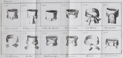 No decided opinion can be given of the age in which Cravats were first introduced. The ancients were happily unacquainted with the ridiculous and dangerous fashion of confining the throat in linen, either tied in front or fastened behind with a clasp; this part of the frame was allowed to remain in[10] entire liberty; they, however, defended it from the cold by means of a woollen or silken cloth, called in Rome focalium, a term which is evidently derived from fauces (the throat).
