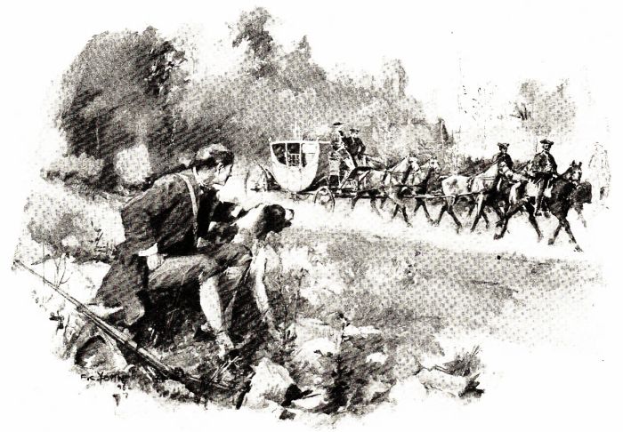 A full game-bag on his back showed what his employment had been, but now he gave himself over to the rare but delicious idleness which occasionally overtakes everybody who tramps long through the woods. He sat down and took off his cap, revealing his handsome blond head. The dog, a beautiful, long-eared setter, laid his nose confidentially upon his master's knee, and blinked solemnly with his large tawny eyes into his master's blue ones. The boy's eyes were remarkable—a light but beautiful blue, and softening a face that even in boyhood was full of resolution, and even of sternness. His figure was as near perfection as the human form could be—tall, athletic, clean of limb and deep of chest, singularly graceful, and developed, as the wise old Greeks developed their bodies, by manly exercises and healthful brain-work and the cleanest and most wholesome living. Neither the face nor the figure could belong to a milksop. The indications of strong passions, of fierce loves and hates and resentments, were plain enough. But stronger even than these was that noble expression which a purity of soul and a commanding will always write upon the human countenance. This boy was a gentleman at heart and in soul—not because he had no temptation to be otherwise, but because he chose to be a gentleman. He sat in silence for half an hour, the dog resting against him, the two communing together as only a boy and a dog can. The sun shone, the wind scarcely ruffled a dying leaf. A crow circled around in the blue air, uttering a caw that was lost in the immensity of the heavens. The silence seemed to grow deeper every moment, when, with a quick movement, George laid his ear to the ground. To an unpractised ear there was not the slightest break in the quiet, but to the boy's trained hearing something was approaching along the highway which induced him to sit still awhile longer. It was some time in coming, for the heavy coaches in those days hung upon wide leather straps, and with broad-tired wheels made much commotion as they rolled along, to say nothing of the steady beat of the horses' hoofs upon the hard road. George's eyes were as quick as his ears, but he caught nothing of the approaching travellers until the cavalcade flashed suddenly into the sun, and with its roar and rattle seemed to spring out of the ground.