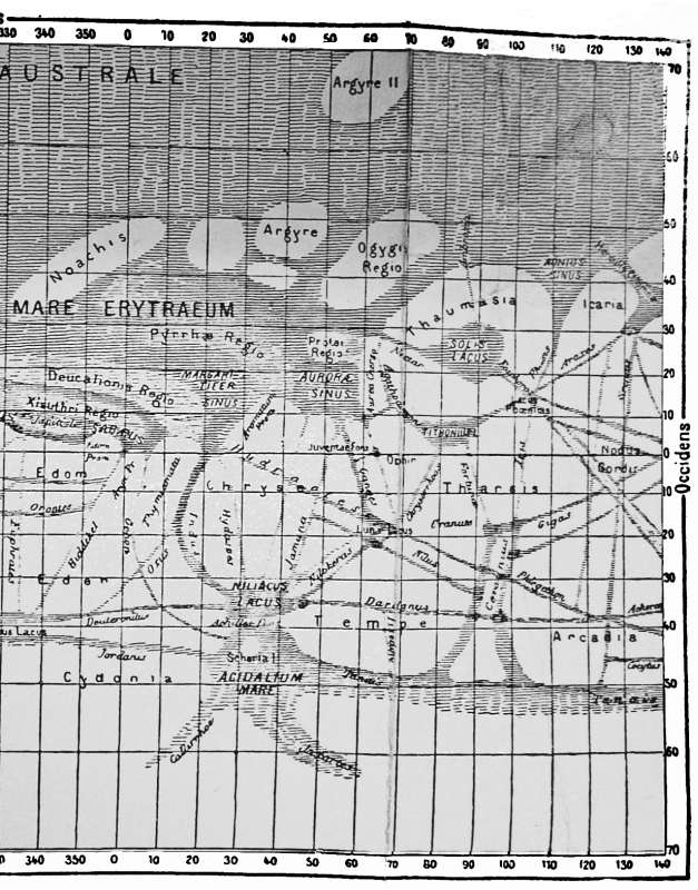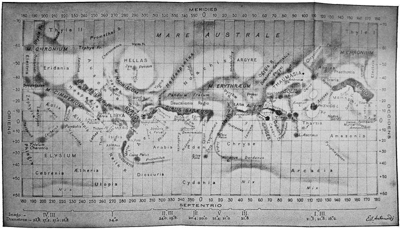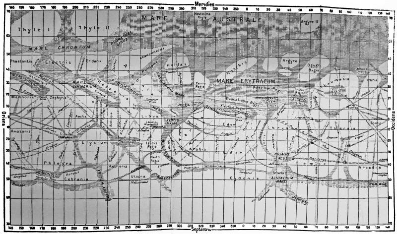 | The controversy about the habitableness of Mars. Humidity on Mars. Early observations. Thexii spectra of Mars and of the Moon compared. Investigations by Campbell and Marchand. The work of Lowell. Measurements by Slipher. Calculations by Very. The temperature on Mars according to these sources. Campbell’s expedition to Mount Whitney in California. Oxygen on Mars. The cold on Mars detrimental to anything but the lowest forms of life. Cause of different results by Slipher and Campbell. Very’s answer to Campbell’s criticism. New measurements by Slipher. Campbell’s new method of measurement of 1910. Christiansen calculates the temperature on Mars from intensity of the Sun’s radiation. The sun-constant. Average temperature of Mars about forty degrees Centigrade. Possibly low plant life around the poles during summer. The canals on Mars are probably fissures in the crust. The length of the canals compared with that of the fissures in Earth’s crust. The double canals on Mars compared with the parallel fissures in Calabria. Emanations along the fissures. The canals as affected by increasing cold or heat. The polar snow. Thawing of the canals. Travel of the water vapour independent of the topography. The desert sand on Mars. Clouds and mists. Highlands and mountains on Mars. Sand filling of the canals. The seas on Mars. The straightness and uniform breadth of the canals an illusion. Light and dark spots. “New” canals. The fancies of Lowell. | |