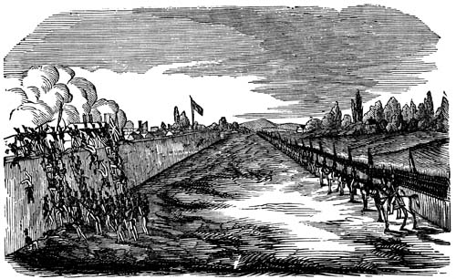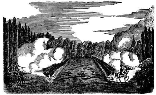 But, if the rulers of Spain, and a few of her pusillanimous[54] nobles, had agreed to accept a king of Napoleon’s choice, not so decided the great body of the people. They everywhere flew to arms. To acknowledge the authority of the self-constituted government, was to declare one’s self an enemy to the nation. Assassinations at Cadiz and Seville were imitated in every part of Spain. Grenada had its murders; Carthagena rivalled Cadiz in ruthless cruelty; and Valencia reeked with blood. In Gallicia, the people assembled and endeavored to oblige their governor to declare war against France. Prompted by prudence, he advised them to delay. Enraged at this, the ferocious soldiers seized him, and, planting their weapons in the earth, tossed him on their points, and left him to die. In Asturias, two noblemen were selected, and sent to implore the assistance of England. In England, the greatest enthusiasm prevailed. The universal rising of the Spanish nation was regarded as a pledge of their patriotism, and aid and assistance was immediately promised and given. Napoleon, with his usual promptness, poured his troops into Spain. They were successful in many places; but the enemy, always forming in small numbers, if easily defeated, soon appeared in another place. The first permanent stand was made at Saragossa. Palafox had, with some hastily gathered followers, disputed the passage of the Ebro, and, routed by superior force, had fallen back upon this city, whose heroic defence presents acts of daring courage of which the world’s history scarcely furnishes a parallel.[55] It was regularly invested by the French, under Lefebre Desnouttes. The city had no regular defences, but the houses were very strong, being vaulted so as to be nearly fire-proof, and the massy walls of the convents afforded security to the riflemen who filled them. The French troops had at one time nearly gained possession of the town, but, for some unknown reasons, they fell back. This gave confidence to the besieged. They redoubled their exertions. All shared the labor,—women, children, priests and friars, labored for the common cause,—and in twenty-four hours the defences were so strengthened that the place was prepared to stand a siege. But the next morning Palafox imprudently left the city, and offered battle to the French. He was, of course, quickly beaten; but succeeded in escaping, with a few of his troops, into the city. A small hill rises close to the convent of St. Joseph’s, called Monte Torrero. Some stone houses on this hill were strongly fortified, and occupied by twelve hundred men. This place was attacked by Lefebre, and taken by assault, on the 27th of June, 1808. The convents of St. Joseph’s and the Capuchins were next attacked by the French, and, after a long resistance, taken by storm. The command of the besiegers was now transferred to General Verdier. He continued the siege during the whole of July, making several assaults on the gates, from which he was repulsed, with great loss. The Spaniards, having received a reinforcement, made a sortie to retake Monte Torrero; but were defeated,[56] their commander killed, and most of their number left dead. On the 2d of August, the enemy opened a dreadful fire on the town. One of their shells lighted upon the powder magazine, which was in the most secure part of the city, and blew it up, destroying many houses and killing numbers of the besieged. The carnage, during this siege, was truly terrible. Six hundred women and children perished, and above forty thousand men were killed.
